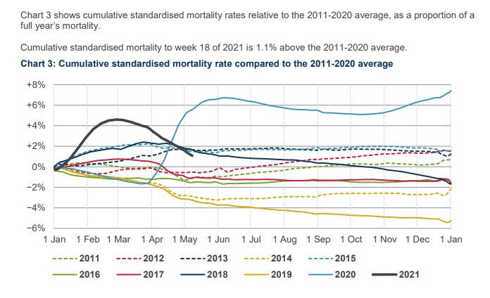 UPDATE: The Institute and Faculty of Actuaries (IFA) has responded to our enquiry and said: “The CMI [Continuous Mortality Investigation] has added the rationale for the change to Chart 3 to its website.” They add: “The CMI intends to continue to use the version of the chart relative to the 10-year average in its quarterly mortality monitors, the next of which is due on July 13th 2021.” So we’ll have to wait until mid-July to get an update against the 10-year average.