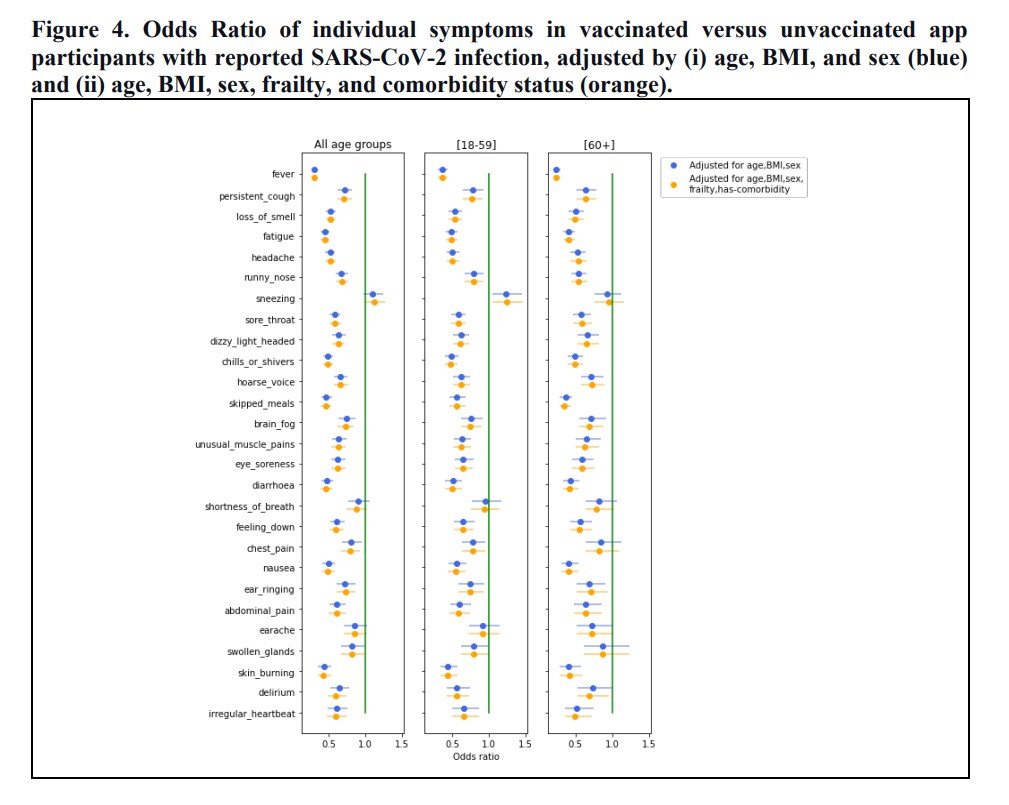 The authors note this means the vaccinated high risk, especially the frail elderly, are still susceptible to infection and serious disease. However, they did find that vaccination cut the general risk of hospital admission by 64% and increased the chance of being asymptomatic by 72% once infected. Infections in vaccinated people were also around half as likely to have more than five different symptoms. Similarly, in infections in vaccinated people, most symptoms were around half as likely to appear (see chart below).