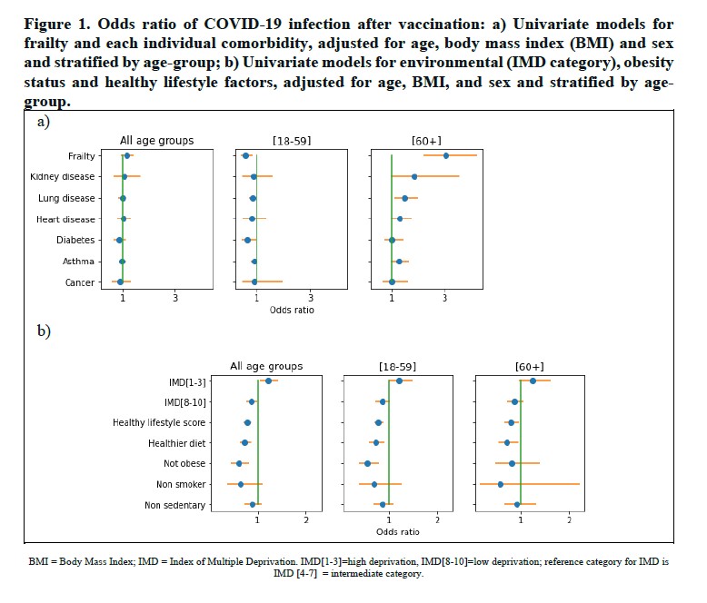 A concerning finding was that the elderly (over-60s) were up to three (2.78) times more likely to be infected after being vaccinated (with one dose of any vaccine) if they were frail than if they weren’t. This is unsurprising perhaps, but still indicative of considerably lower protection for those already at higher risk from the disease. Furthermore, a quarter of the vaccinated frail elderly in the study who contracted the virus ended up in hospital, which is not a small proportion (though no figure was given for the hospitalisation rate of unvaccinated frail elderly people against which to compare it).