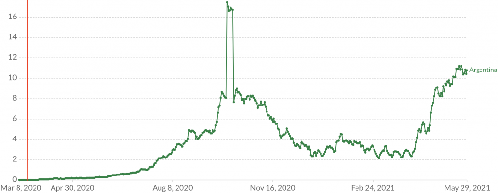 Argentina imposed a total border closure on March 16th (see chart below), but this did not prevent a major epidemic from burgeoning in the country’s spring. Note that the policy was put in place 199 days before the peak of daily deaths, which would be the equivalent of the U.K. having closed its borders on September 27th 2019.