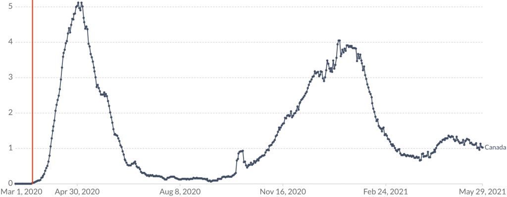 Canada imposed a total border closure on March 18th (see chart below). This was too late to prevent the first wave. Yet the policy has been in place ever since, and it did not stop a second wave from emerging in the autumn.