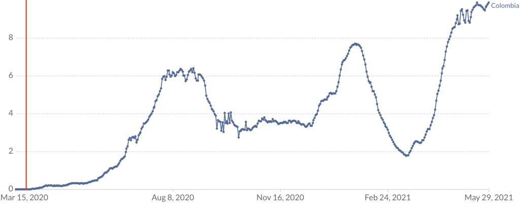 Colombia imposed a total border closure on March 25th (see chart below), but this did not prevent a major epidemic from burgeoning in the country’s spring. Note that the policy was put in place 131 days before the peak of daily deaths, which would be the equivalent of the U.K. having closed its borders on December 4th 2019.