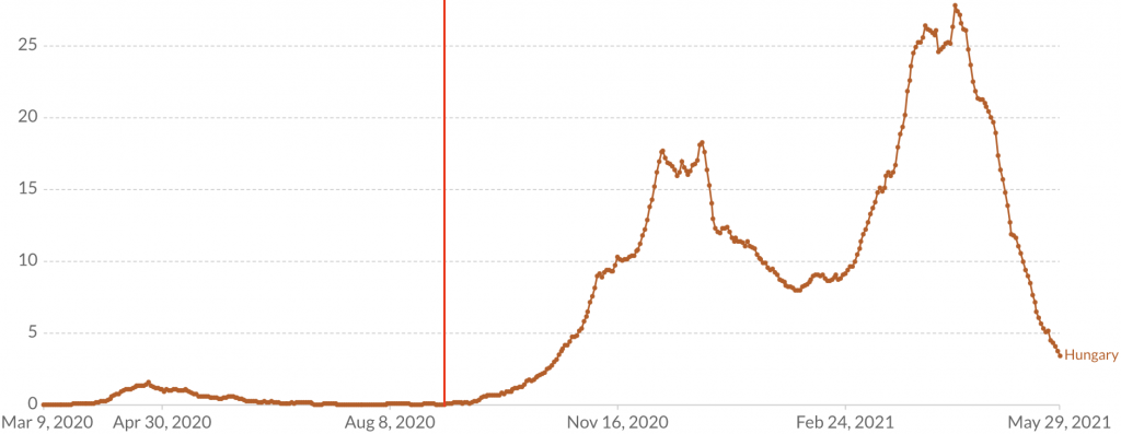 Hungary imposed a total border closure on September 1st (see chart below), but this did not prevent two major epidemics from burgeoning in the autumn and the spring. Note: the Blavatnik School rates countries’ travel restrictions on a 0–4 scale (with 4 corresponding to a “ban on all regions or total border closure”) and Hungary’s rating hasn’t gone below 3 since March 9th 2020. (By comparison, South Korea has never had a rating of 4.)