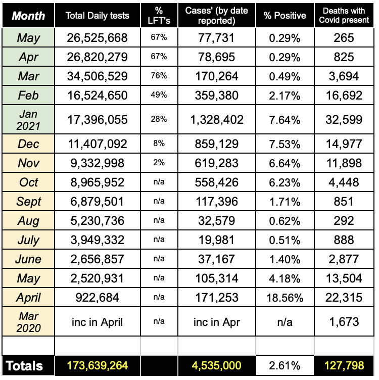 Stop Press: A reader has compiled a table showing the total daily tests, the number of cases, the percentage of tests that are positive and the number of Covid deaths recorded in each month dating back to March 2020. As you can see, there’s been a steady decline in the number of deaths since their peak in January 2021.