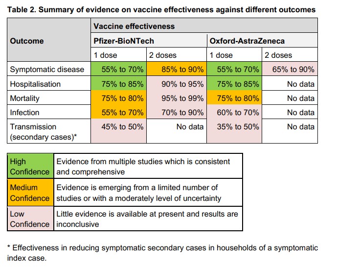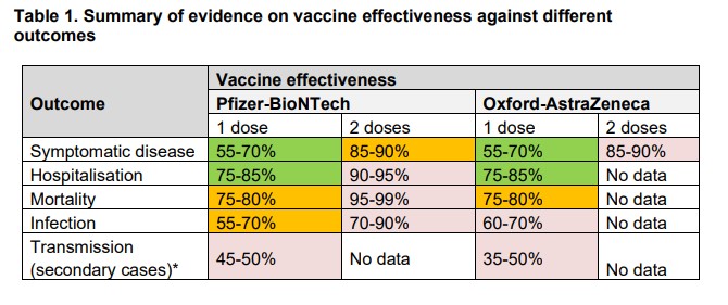 As I noted last week, this 66% effectiveness of AstraZeneca (against the British Alpha variant) was a long way below the 90% in the over-65s claimed in Report 2. It’s probably a sign of how low my opinion is of PHE vaccine studies that I was pleasantly surprised to see this discrepancy actually make an impact on the data presented in Report 3, and you can see below in the AstraZeneca two-doses box (top right) week 20’s “85-90%” has become “65% to 90%” in week 21. There is still no explanation from PHE, however, as to why one of their studies finds AstraZeneca 90% effective against symptomatic infection in the over-65s while another finds it is just 66% effective in all ages. Is this not the kind of discrepancy that should occasion comment from the authors?