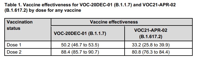 The authors appear still to be working out what exactly their reports are for as each of the three to date presents different information in a slightly different way. While the first was largely a summary of evidence published elsewhere, the second served more as a showcase for PHE’s latest study and focused on effectiveness against symptomatic disease in the over-65s (90%, supposedly). This week, the over-65s are gone and the focus is on effectiveness against the Indian variant. This makes reading the reports quite confusing, as each doesn’t feel so much like an update to the previous one as a stand-alone report on a separate topic.