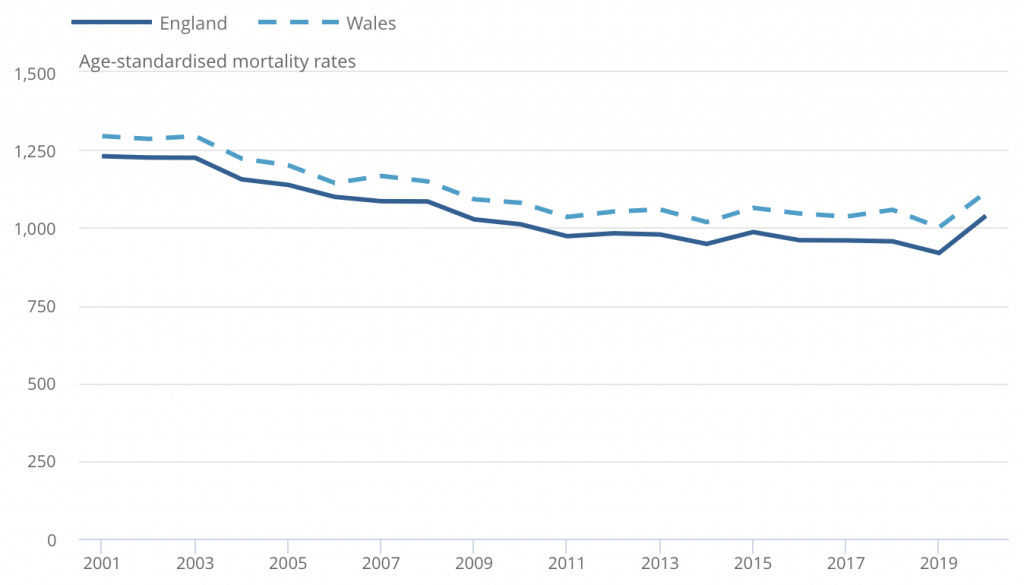 And if you look at the age-adjusted mortality rates, which take into account the size and age of the population, you can see that while 2020 has undoubtedly been a bad year compared to recent years, what has been seen in terms of people dying is not completely out of sync with recent history. It is actually comparable with what happened in the 2000s.