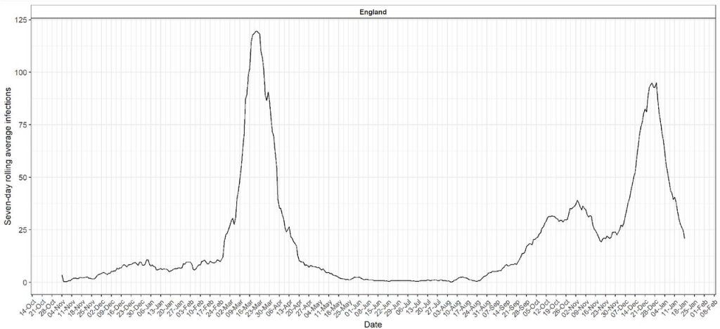 I am of the view that the huge Jan 2021 peak is secondary to initiation of mass vaccination. The timing fits exactly, in each age group & location (eg care homes vs community by age). In each region, cases rose in synchrony with roll out of mass vaccination everywhere, which is why the ramp is so steep. Quite unlike the late autumn, early winter secondary ripple.