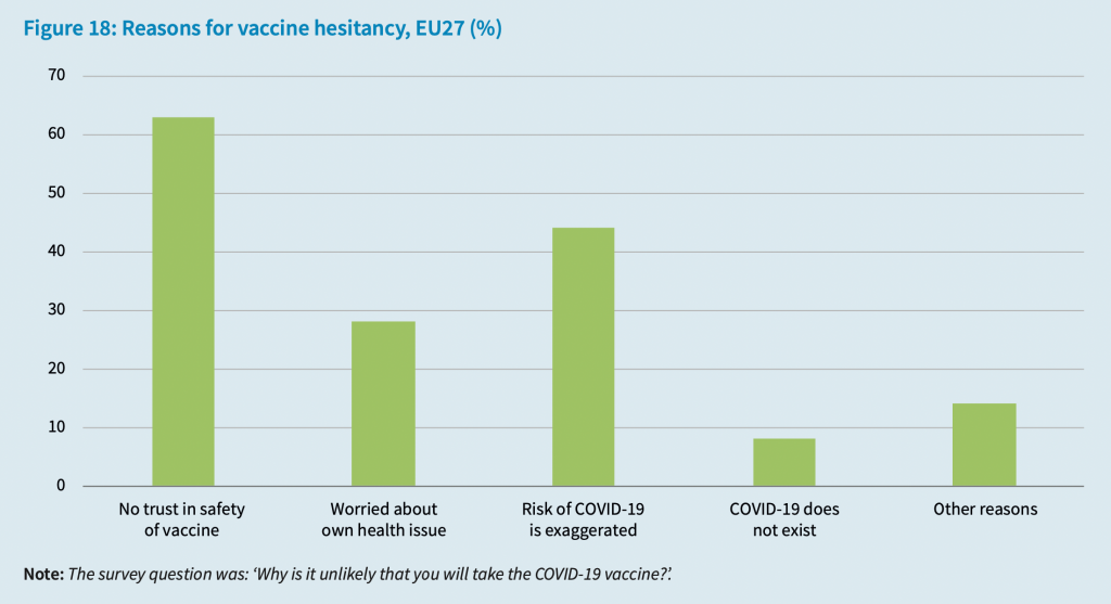 These findings echo those of another survey recently conducted by the E.U. agency Eurofound which suggested that more than a quarter of adults in the E.U. are either “very unlikely” or “rather unlikely” to accept a Covid vaccine. The main reason cited by participants was a lack of trust in the safety of the vaccine. Almost half of those who were unlikely to accept a Covid vaccine said the risks associated with the virus has been exaggerated and eight per cent believed that Covid didn’t exist at all.
