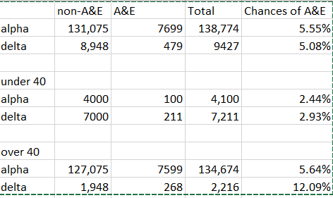 Ben Sorry I only just saw this. As I say, I am not familiar with the stratification process they actually used but I am willing to have a bash explaining the principle of stratification. I apologise if what follows is obvious – it is hard to know where to begin! Let’s take one factor age as an example. The principle is simple. Age is a confounding variable which can result in confounding bias if not allowed for. Because there are proportionally more young people with the Delta variant than the Alpha variant and young people have a lower chance of going to A&E it can appear that it is the Delta variant that is reducing your chances of going to A&E when it is actually your age. What we really want to know is for two people of the same age, one with Alpha and the other with Delta, which is the more likely to end up in A&E and how big is the difference. Stratification is one way round this. You break up the population by age and work out the chances of each age group ending in A&E. The paradoxical thing is that it can work out that… Read more »