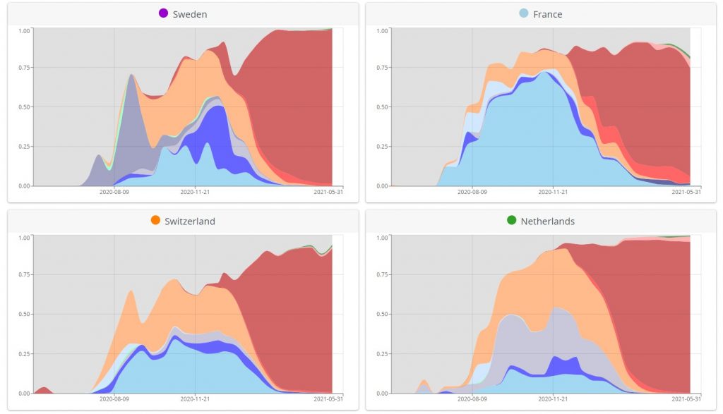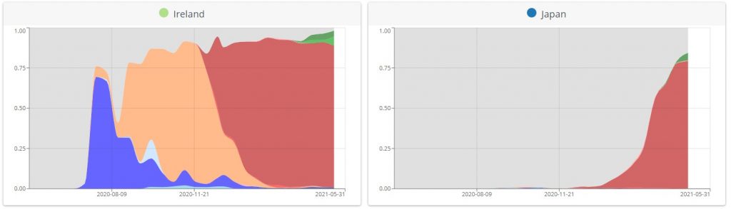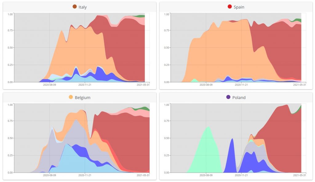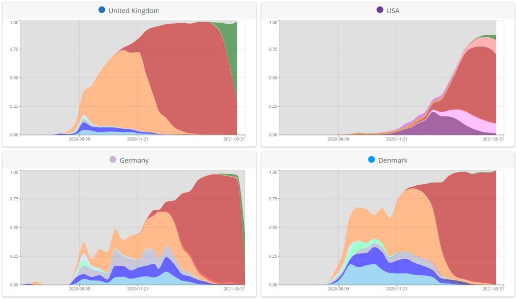 But in terms of the Delta variant being hyper-infectious, what I want to know is why it only seems to be highly infectious in the U.K. Everywhere else (except India, of course) it’s hardly making any impact, despite having been around as long as it has in the U.K. Here are some of the latest graphs from CoVariants, with the Delta variant in dark green and Alpha (British) variant in red.