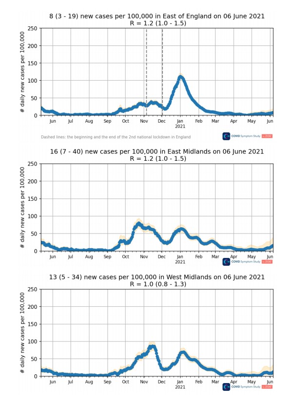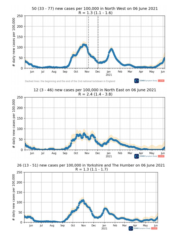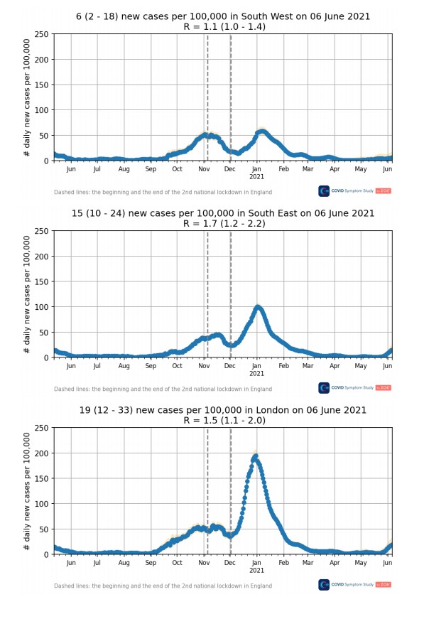 I admit that I have been a bit surprised by the late spring and early summer infection spike we’re currently seeing. Oddly, it happened simultaneously in many regions including the North East and South East around the end of May, as the latest ZOE data shows. In most places it was too late to be explained by the May 17th lockdown easing (or, in the case of the North West, too early).