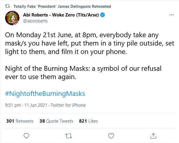 A combination of British optimism and British irony I’d say. To be fair I don’t think Toby has ever said he will ignore the face mask regulation from 22 June but both Julia Hartley-Brewer and Allison Pearson have.