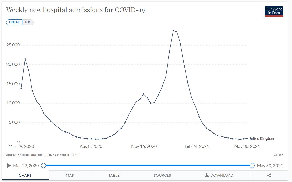 How can it “continue to lead to significant increases in hospitalisations?” when it hasn’t done anything of the sort so far – yes a few more people in hospital, but fewer today than yesterday and still FAR fewer than the most optimistic SAGE view.