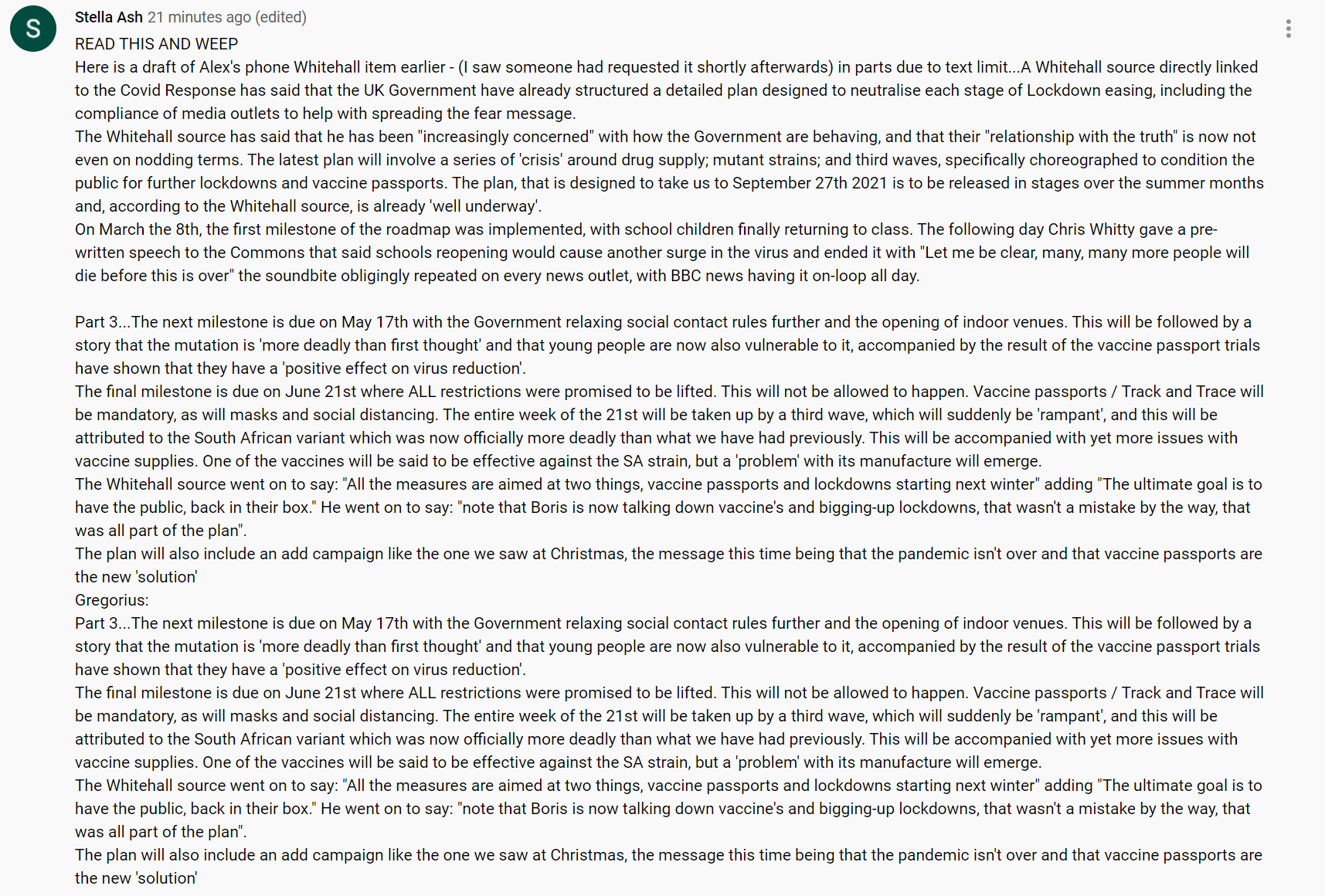 It’s very strange. The bulk of people I talk to now are resigned to June 21 not happening, confess that it’s all rubbish and yet admit they’ll follow the ‘rules’. The PsyWar is won (or lost, from our perspective) Part of me won’t feel too sad when 1000s are taken this winter due to being jabbed.