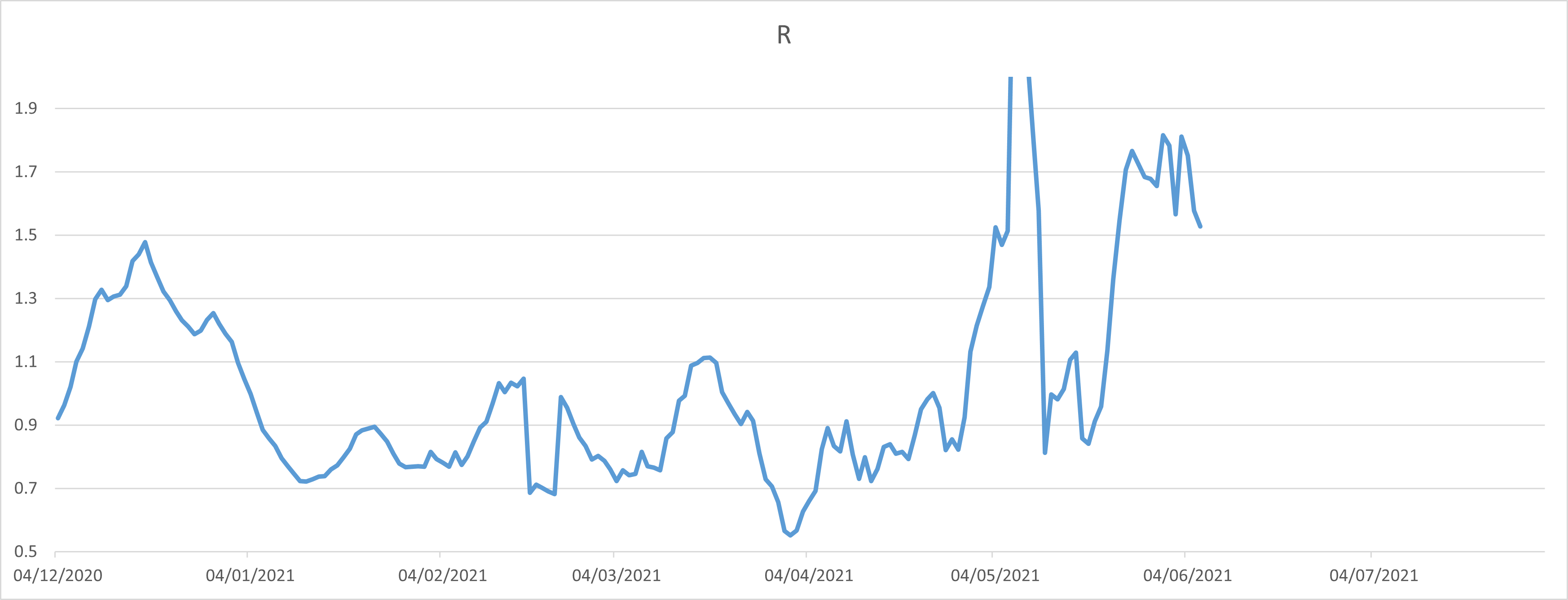lastest ‘wave’ is from the time R goes above and stays above 1 – several days after the pubs opened and the onset of the Indian scariant