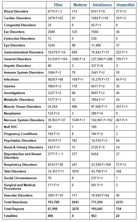 This is the fifth of the weekly round-ups of Covid vaccine safety reports and news compiled by a group of medical doctors who are monitoring developments but prefer to remain anonymous in the current climate (find the fourth one here). By no means is this part of an effort to generate alarm about the vaccines or dissuade anyone from getting inoculated. It should be read in conjunction with Lockdown Sceptics‘ other posts on vaccines, which include both encouraging and not so encouraging developments. At Lockdown Sceptics we report all news about the vaccines whether positive or negative and give no one advice about whether they should or should not take them. Unlike with lockdowns, we are neither pro-vaccine nor anti-vaccine; we see our job as to report the facts, not advocate for or against a particular policy. The vaccine technology is novel and the vaccines have not yet fully completed their trials, which is why they’re in use under temporary and not full market authorisation. This has been done on account of the emergency situation and the trial data was largely encouraging on both efficacy and safety. For a summary of that data, see this preamble to the Government’s page on the Yellow Card reporting system. We publish information and opinion to inform public debate and help readers reach their own conclusions about what is best for them, based on the available data.