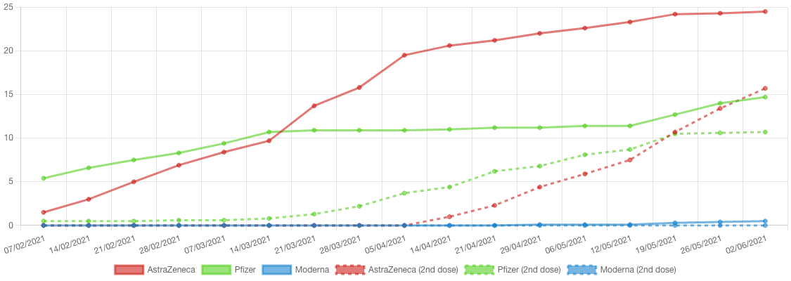 A curiosity is that the rate of Yellow Cards went up for Moderna from an already very high level (higher than at any point for AstraZeneca) despite there being only 60,000 shots administered this week.
