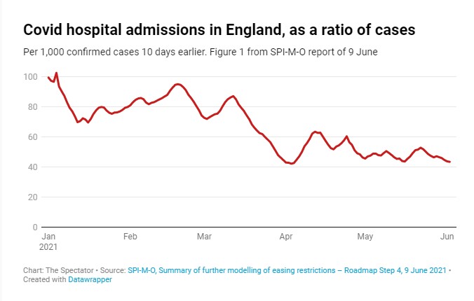 Ross Clark suggests the problem with the earlier data was that the sample size was small and biased. As he notes, PHE’s modelling misses the most obvious data point, that the rate of hospitalisations per case has not increased as the Indian variant has become dominant (see graph below). How then can the Indian variant have twice the risk of hospitalisation?