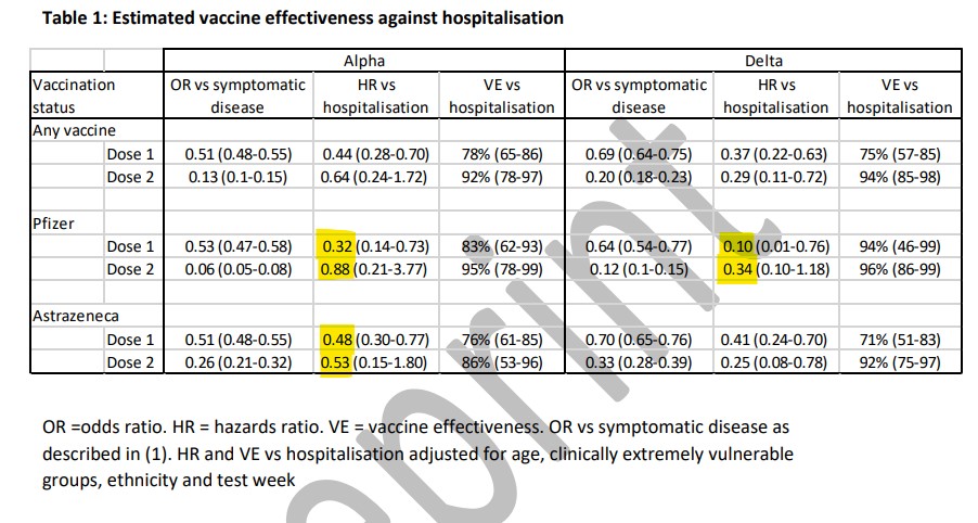 Not meaning to rain on the parade, but the conclusion in the header ignores the uncertainty in the estimates. The numbers vaccinated who develop symptomatic disease is large enough for the odds ratio to be well-estimated and incremental benefit shown. The numbers admitted to hospital are so small that there is a very imprecise estimate of hazard ratio, and it is the width of the intervals in the table, not the highlighted point-estimate that matters.