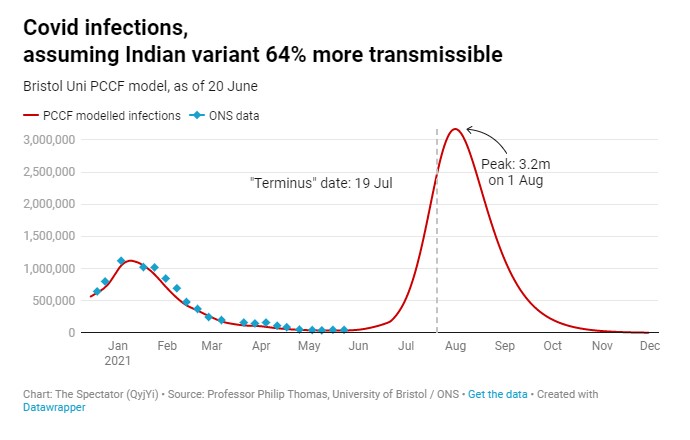 The Bristol model reckons 85% of adults in England have detectable antibodies, with just two-thirds of whole population (i.e., including kids) immune. It assumes the Indian variant is infectious enough to work its way through everyone who remains susceptible, even if they end up with nothing more than a runny nose. The good news is that this will, at least, rule out a winter wave: by September there will be almost nobody left to infect.