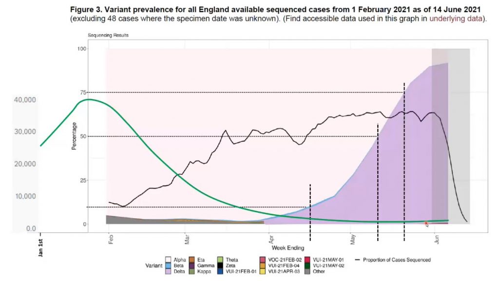 Further countering the idea of a hyper-transmissible Delta variant, Ivor Cummins has shown that the growth in dominance of the Delta variant has not coincided with a spike in infections (see graph below – the green line is positive cases superimposed on a graph of variant proportions, with the Delta variant in purple).