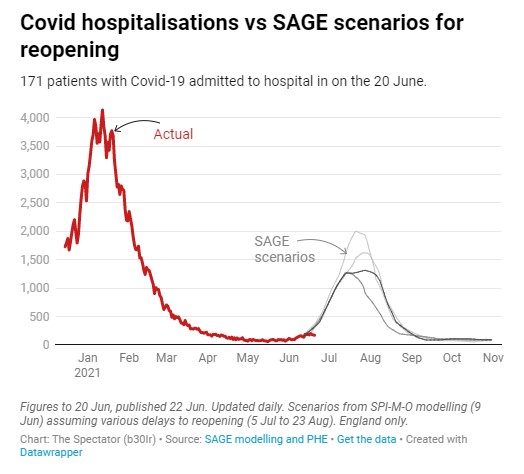 The models the Government is relying on to justify continuing lockdown have not got off to a good start. The projections of the huge summer wave should “freedom day” not be delayed are, as of June 21st (so before any delay could make a difference), almost twice as high for hospital occupancy as the actual number of Covid patients in hospital (see graph above).