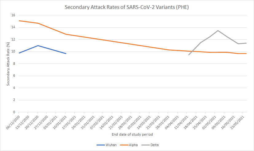 We also see that the Delta variant’s SAR is currently only a little above the Alpha variant’s: 11.4% of contacts infected versus 9.7%, a difference of just 1.7%. In addition, the Delta variant’s current SAR is no different to the Alpha variant’s at the start of March, undermining the idea that it is intrinsically more infectious.