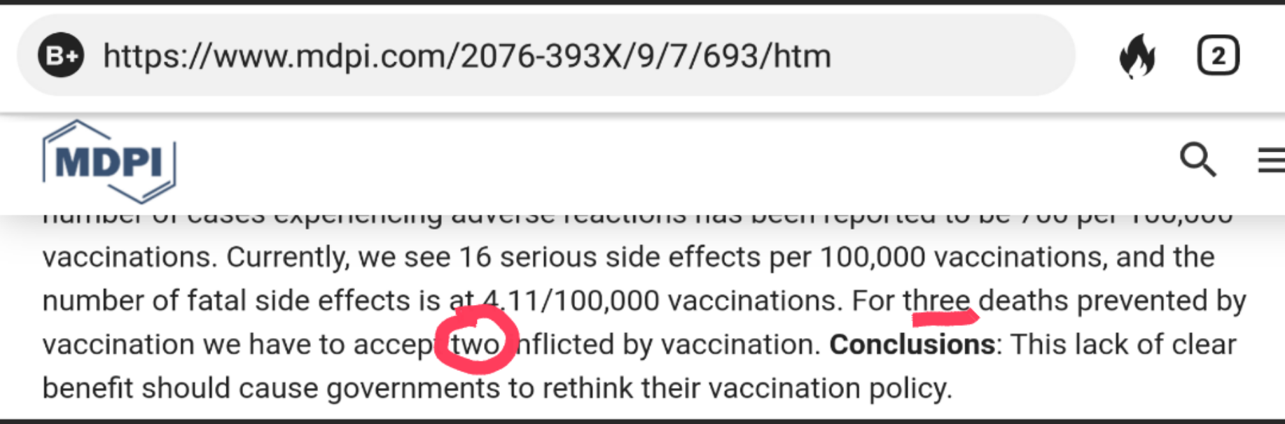 “…the NNTV to prevent one death is between 9,000 and 50,000 (95% confidence interval), with 16,000 as a point estimate. The number of cases experiencing adverse reactions has been reported to be 700 per 100,000 vaccinations. Currently, we see 16 serious side effects per 100,000 vaccinations, and the number of fatal side effects is at 4.11 per 100,000 vaccinations. For three deaths prevented by vaccination, we have to accept one inflicted by vaccination.” They made an error in their abstract. It should have been two, not one, death(s) inflicted by ‘vaccination’. According to the study, if we take 16,000 as their point estimate as NNTV to prevent one death, then every 100,000 so-called ‘vaccinations’ on average would save 100/16 = 6.25 lives, yet would kill 4.11 people and result in 700 adverse reactions. Or around 1.52 people are allegedly ‘saved’ for each person killed, and many, many more injured or disabled, even if we accept the implausible claim that some lives are saved by injecting a toxic spike protein. The results section of the paper clarifies: “Thus, we need to accept that around 16 cases will develop severe adverse reactions from COVID-19 vaccines per 100,000 vaccinations delivered, and approximately four… Read more »