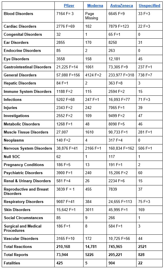 This is the seventh of the weekly round-ups of Covid vaccine safety reports and news compiled by a group of medical doctors who are monitoring developments but prefer to remain anonymous in the current climate (find the sixth one here). By no means is this part of an effort to generate alarm about the vaccines or dissuade anyone from getting inoculated. It should be read in conjunction with Lockdown Sceptics‘ other posts on vaccines, which include both encouraging and not so encouraging developments. At Lockdown Sceptics we report all the news about the vaccines whether positive or negative and give no one advice about whether they should or should not take them. Unlike with lockdowns, we are neither pro-vaccine nor anti-vaccine; we see our job as reporting the facts, not advocating for or against a particular policy. The vaccine technology is novel and the vaccines have not yet fully completed their trials, which is why they’re in use under temporary and not full market authorisation. This has been done on account of the emergency situation and the trial data was largely encouraging on both efficacy and safety. For a summary of that data, see this preamble to the Government’s page on the Yellow Card reporting system. (Dr Tess Lawrie recently wrote an open letter to Dr June Raine, head of the MHRA, arguing that: “The MHRA now has more than enough evidence on the Yellow Card system to declare the COVID-19 vaccines unsafe for use in humans”, a claim that has been “fact checked” here.) We publish information and opinion to inform public debate and help readers reach their own conclusions about what is best for them, based on the available data.