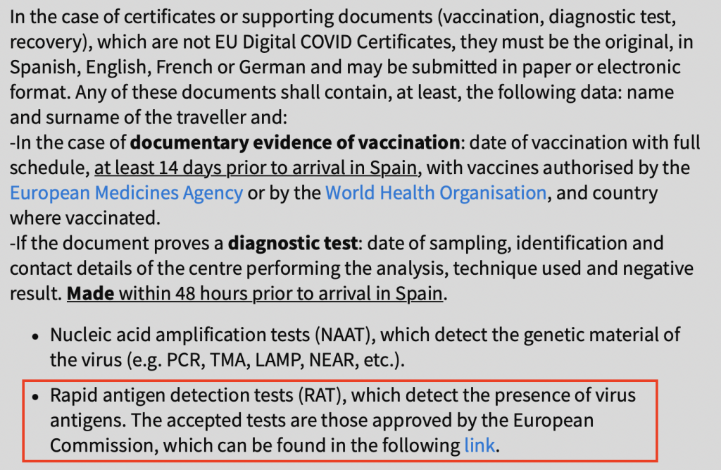The website tells readers to “see Spain Travel Health page for specific details regarding the documentation you must present to accredit your Covid test results and proof of vaccination”. But when you do this, you find that antigen tests are, in fact, accepted, so long as the providers are approved by the European Commission.