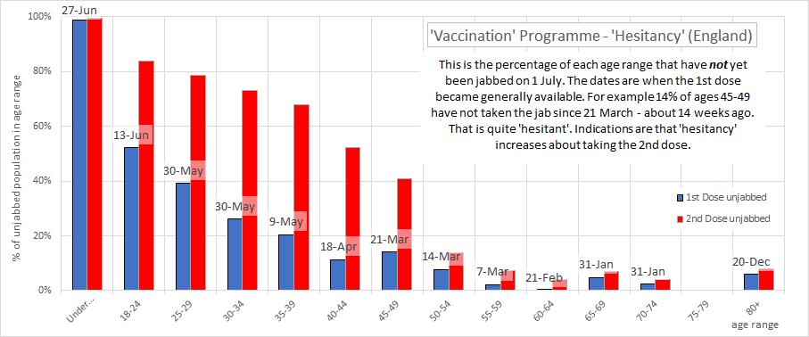 So about 14% are ‘hesitant’. Let’s see what proportion of other age groups are ‘hesitant’. Hmmm. Seems that 14% of 45-49 year-olds have been ‘hesitant’ for 14 weeks. It’s about bloody time they made their minds up, eh?