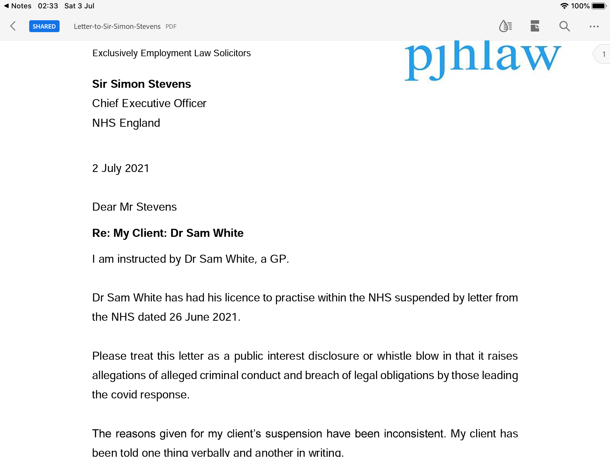 Has everyone seen the letter dated 02/07/2021 to Sir Simon Stevens CEO NHS England from the legal team of Dr. Sam White who had his licence to practice within the NHS suspended on 26/06/21?