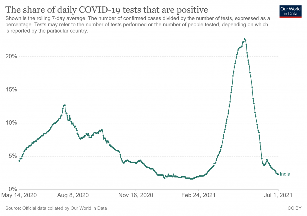 The notion that a threshold of herd immunity will only be reached if 85% of the population is vaccinated also bears no relationship to real-world data. It’s not entirely clear what Segal and Spector mean by herd immunity in these tweets, but if they mean that without an 85% vaccination rate the Delta variant will continue indefinitely to cause mass hospitalisations and deaths, then perhaps they would like to explain why India’s test positivity rate entered a sustained plummet nearly two months ago, despite the Delta variant being dominant and the country at that point having only 2.5% of its population fully vaccinated? (The figure now stands scarcely higher at 4.3%.)