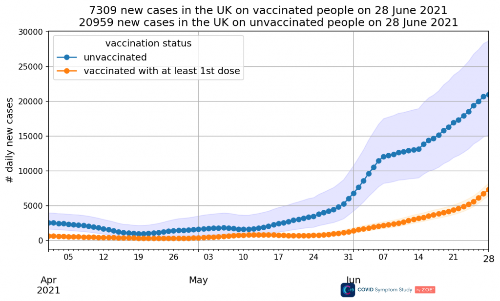 Stop Press: According to the ZOE app’s latest daily report, symptomatic infections in people vaccinated with at least one dose are increasing about as fast as in unvaccinated people, albeit from a lower level. While the data on vaccine effectiveness against serious illness and death has been consistently encouraging, data on effectiveness against infection has been more mixed, and this latest data suggests some of the more optimistic estimates may be on the high side.