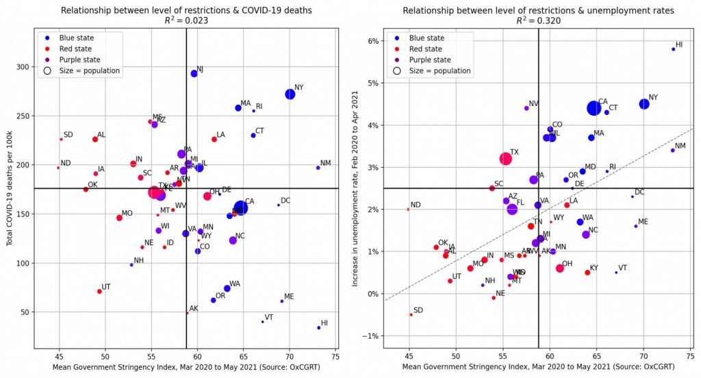 Comparing the 50 U.S. states, Gu obtained data on the COVID-19 death rate, the change in unemployment rate, and the average Government Stringency Index. The latter is a measure of the number and severity of restrictions imposed during the course of the pandemic (school closures, stay-at-home orders, etc.). Gu’s two main charts are shown below: