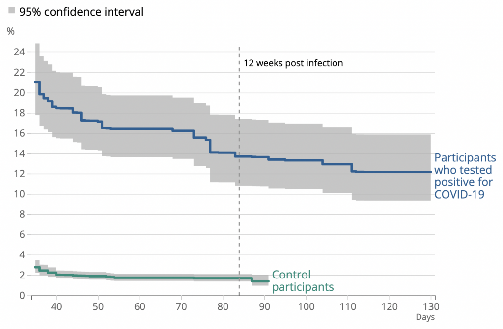 The ONS has documented that almost 14% of people who test positive for COVID-19 continue to report at least one symptom 12 weeks later. This estimate is based on data from the Coronavirus Infection Survey (CIS) – a large, random sample of UK residents living in private households. Here’s the ONS’s chart: