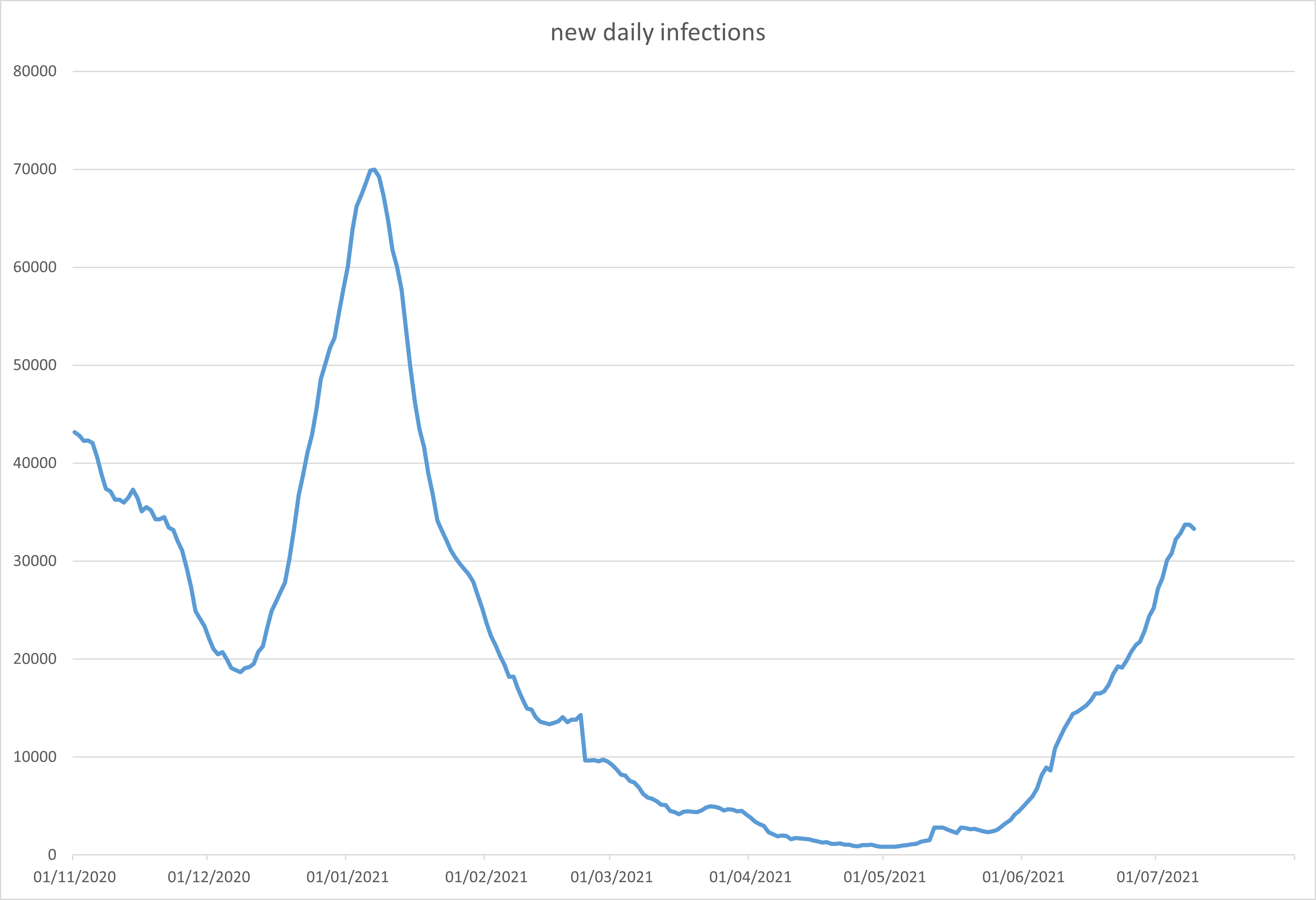 Scotland cases have halfed in a week. So could be a sign that the numbers are in fact peaking. It is summer after all. And cases are noise of course.