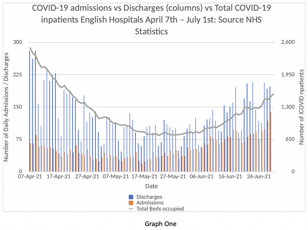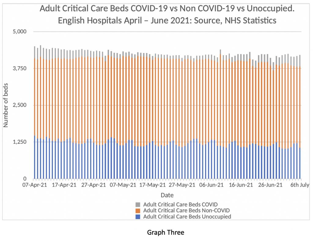 Next, consider Graph Two. We have heard much in the media about the unprecedented pressure the NHS is under with COVID-19 and how worrying it is when cases continue to rise with the Delta variant. Graph Two shows how much pressure the NHS is under with COVID-19 admissions up to July 6th.