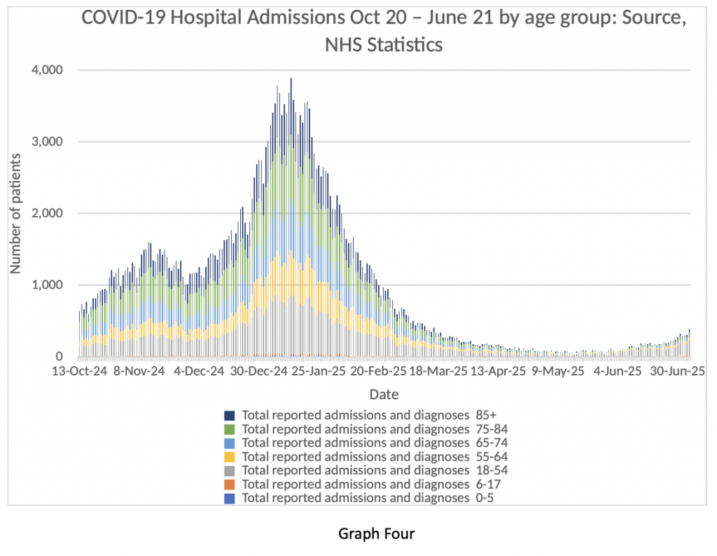 Let’s have a look at Graph Four next. It shows the age breakdown of COVID-19 inpatients from October 2020 to the beginning of July 2021. Quite a ‘busy’ graph, so I will explain. Look at the winter peak, which is obvious. A big spike in dark blue, green, light blue and yellow bands. Those are all patients in the age bracket 55-85+.