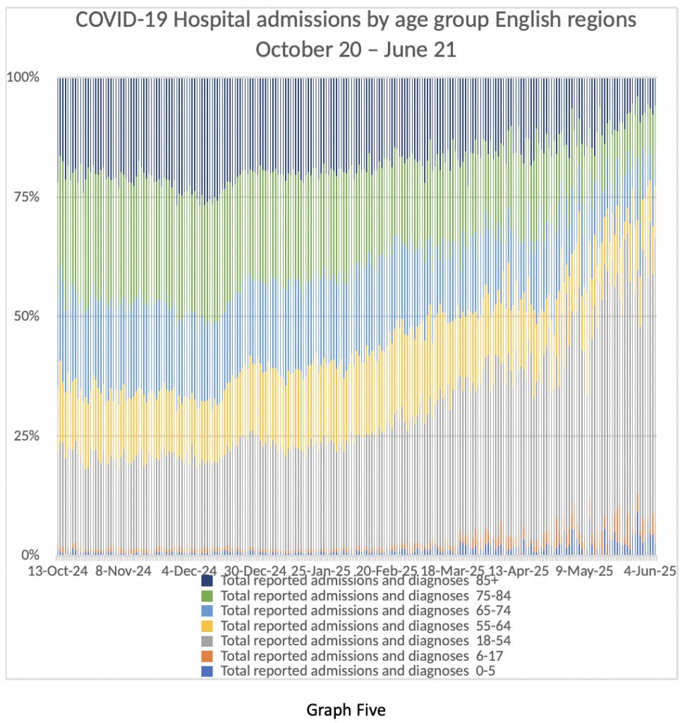 Graph Five shows the same data in a slightly different way – age bands of admitted patients as percentages over the same time period. The same point is quite obvious. Older patients who are more likely to be very ill and far more likely to die are being admitted in fewer numbers than in the winter or last spring. Younger patients have milder illness, spend less time in hospital and are very unlikely to die from COVID-19. Further comment is not required.