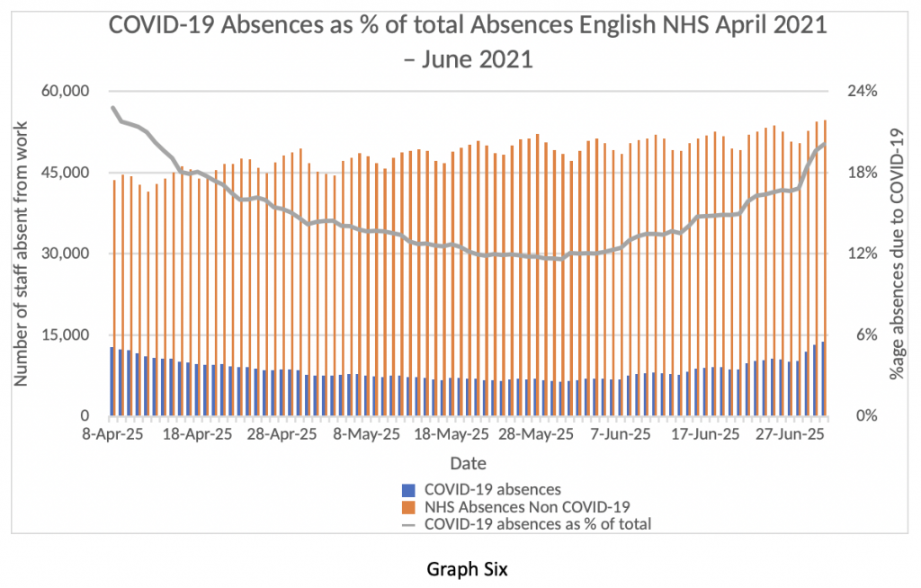 Finally, I invite readers to consider Graph Six. This graph looks at people taking time off work from their NHS jobs between April 7th and June 30th. The blue bars represent people taking time off due to COVID-19 related absence – that means either showing symptoms of COVID-19 themselves or having come into contact with someone with a positive COVID-19 test. The orange bars represent people taking a day off from their NHS work for non-COVID-19 related reasons.