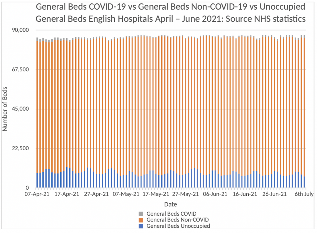 Can you see the grey bars? It’s really quite difficult because they are on top of the orange bars and represent about 1.5% of the total beds available in English Hospitals. At present, we have about 8% of bed capacity spare. Readers can draw their own conclusions about the current “pressure on the NHS from COVID-19” from this graphic. I re-emphasise, these are the official NHS figures released on Thursday July 8th – I am not making this stuff up.