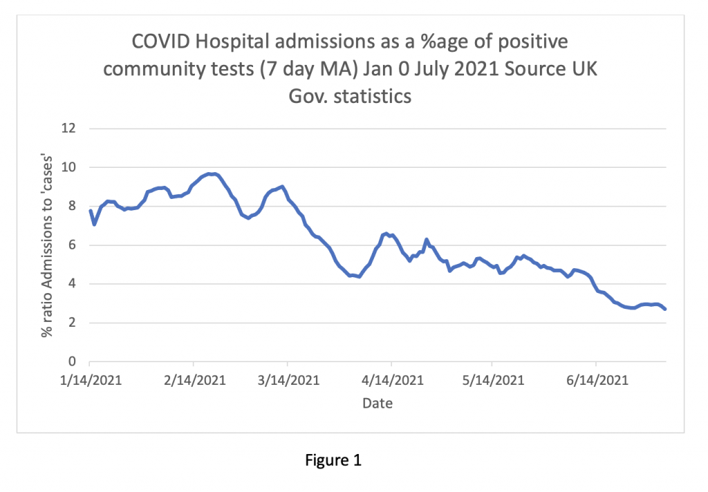 My overall impression of the current data so far is that the ‘Third Wave’ of COVID-19 is much less of a problem than the first two waves. The ratio of admissions to positive tests has fallen from nearly 10% in February to lower than 3% currently (see Figure One below). The vast majority of positive tests are asymptomatic. The symptomatic cases are milder and the majority of patients attending hospital are sent home from A&E. Those admitted have shorter lengths of stay, fewer people need intensive care and deaths are infrequent.