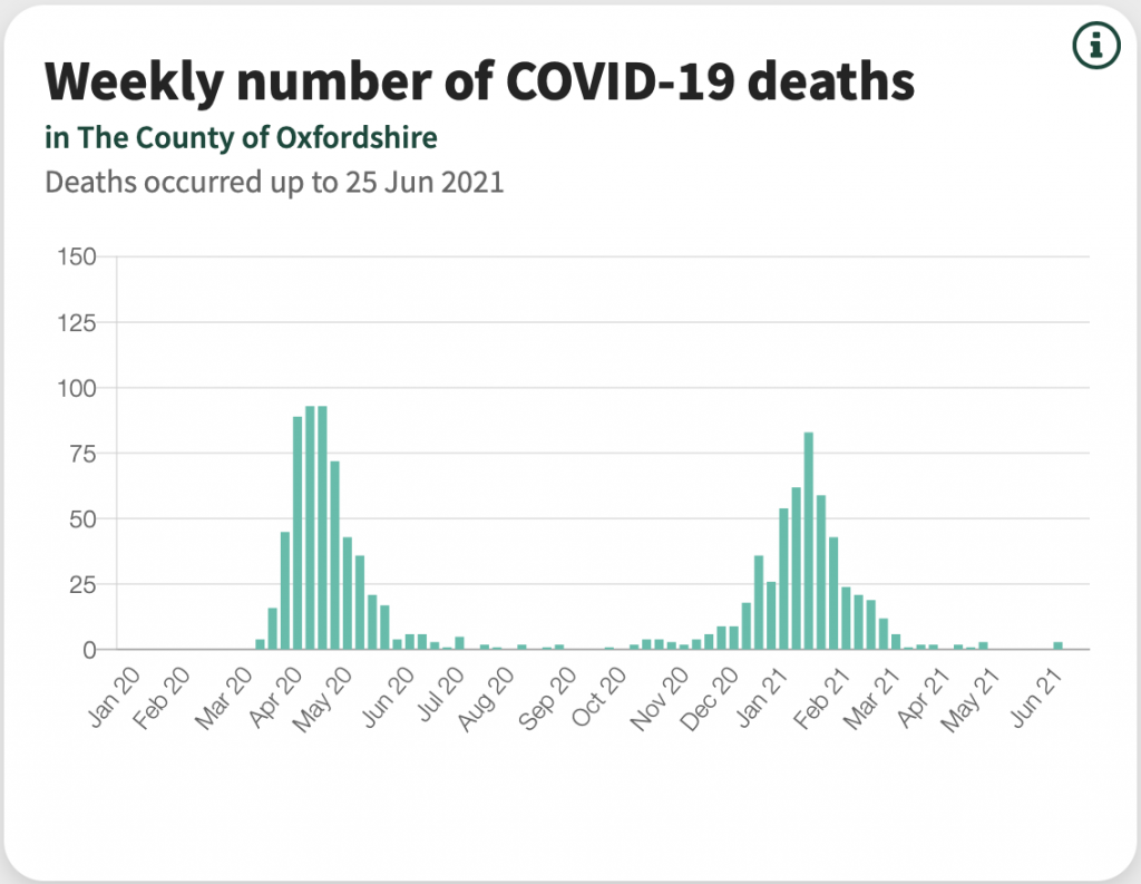 The number of positive Covid tests in Oxford has been on the up in recent weeks, but deaths remain low, with zero deaths having been recorded in seven of the last 10 weeks and no more than three deaths recorded in the other three weeks.