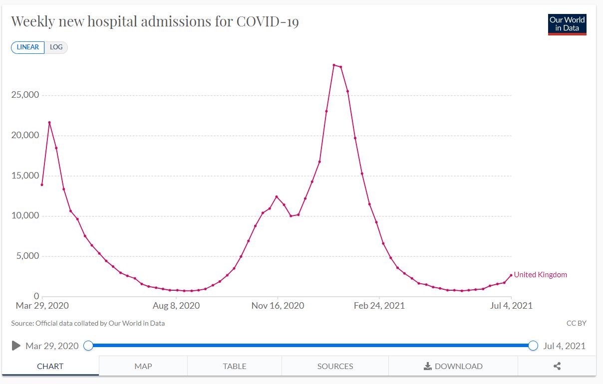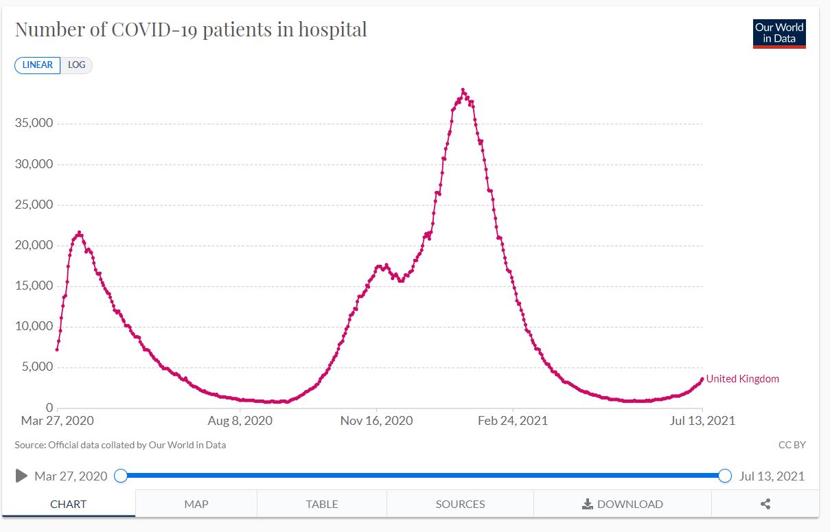 The number of Covid patients actually in hospital is going up very slowly. There are about 1200 hospitals in UK and 3600 patients (with Covid but not necessarily admitted for it) so typically 3 per hospital.