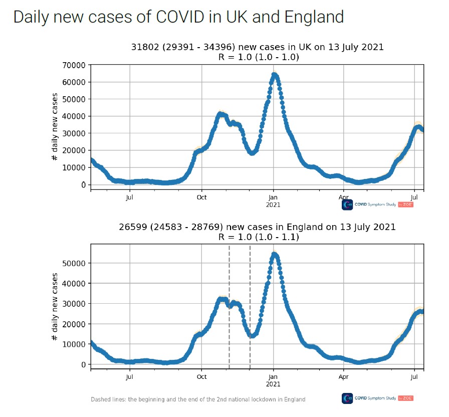 Why the discrepancy? Is it because the Government figures include all the lateral flow tests that schoolchildren are taking as they isolate? 839,100 children – 11.2% of the total pupil population, more than one in 10 – were absent from state schools for Covid-related reasons on July 8th. All of them will have been tested and this will be picking up asymptomatic or mild infections that would usually not be noticed. ZOE data is symptom based, with a confirmatory PCR test, so would not be affected by surges in lateral flow testing among schoolchildren picking up asymptomatic infections.
