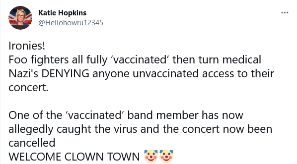 Foo Fighters – pro-vacine and all band members have been jabbed – their concerts would only accept those fans who have been jabbed – their concerts have all now been called off because one of the jabbed band members has tested positive for covid.