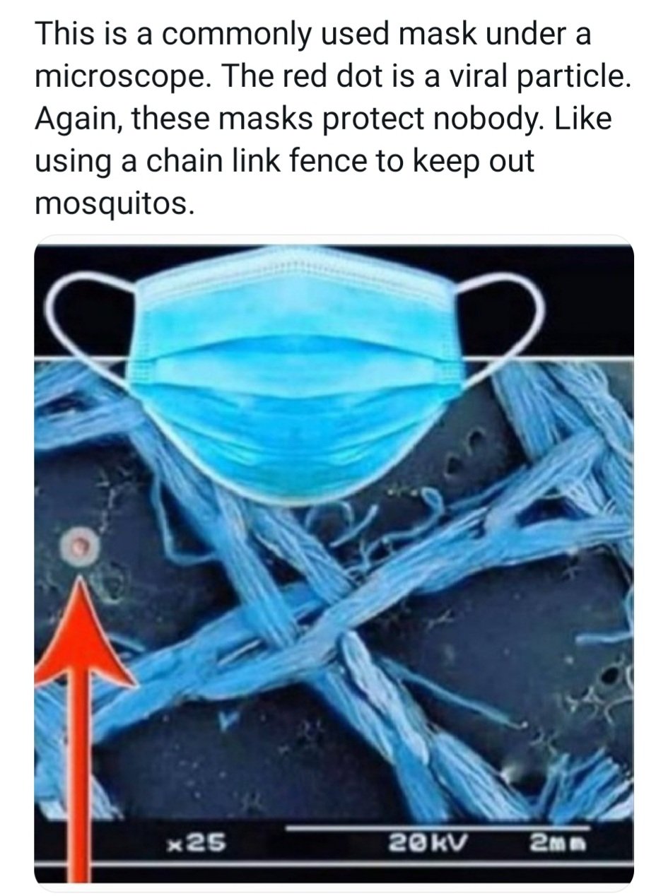 One only has to consider the masks used by paint sprayers, think about the size of a paint droplet, and the fact that they have a face-fit test for them, but can the plebs see that? Not a chance. Ok, plebs, it’s like a chicken wire umbrella… get it? No.
