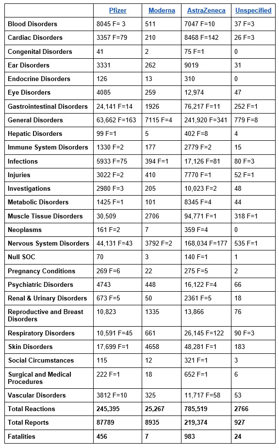 - Nervous System Disorders – 44,131 (Pfizer) + 168,034 (AZ) + 3,792 (Moderna) + 535 (Unknown) = 216,492